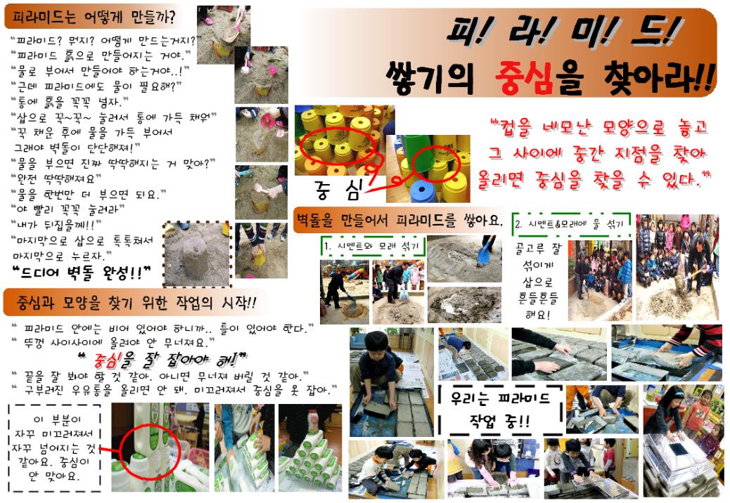 Ä£±¸ ÇÑ ¸íÀÌ ¹æ¹ýÀ» ¾Ë¾Æ³Â´Ù¸ç ³ª¹«ÅëÀ» ±âº»´ë·Î »ï¾Æ¼ ÀÛÀº È뺮µ¹À» ¸¸µé¾î¼ ½×±â ½ÃÀÛÇß´Ù. ¡° ¼±»ý´Ô Àß º¸¼¼¿ä. À̰Ŵ ÀÌ·¸°Ô ½×À¸¸é µÉ °Í °°¾Æ¿ä.¡± ¡°±×·±µ¥ º®µ¹µéÀÌ ´Ù Çϳª°¡ µÇ¾î¹ö·È´Âµ¥.. À̰ŠÀ§·Î ½×¾Æ¼ °è´Üó·³ ÇǶó¹Ìµå·Î ¸¸µé ¼ö ÀÖÀ»±î?¡± ¡°ÀÌ·¸°Ô ÇÏ¸é °è´Ü¸ð¾çó·³ µÇ´Âµ¥..¡± ¡°Åë¿¡ ÈëÀ» ²À²À ³ÖÀÚ.¡± ¡°²Ú ä¿î ÈÄ¿¡ ¹°À» °¡µæ ºÎ¾î¼ ±×·¡¾ß º®µ¹ÀÌ ´Ü´ÜÇØÁ®!¡± ¡°¹°À» ºÎÀ¸¸é ÁøÂ¥ µüµüÇØÁö´Â °Å ¸Â¾Æ?¡± ¡°¸¶Áö¸·À¸·Î »ðÀ¸·Î Åå! Åå! Ãļ ¸¶Áö¸·À¸·Î ´©¸£ÀÚ!!¡± ¡°µåµð¾î º®µ¹ ¿Ï¼º!!¡± ÇÏÁö¸¸ ÈëÀ¸·Î ¸¸µç º®µ¹Àº ¼ÕÀ¸·Î °Çµå¸®°Ô µÇ¸é ±Ý¹æ ¹«³ÊÁö°Ô µÇ¾ú´Ù. ÇǶó¹Ìµå¸¦ °è´Ü½ÄÀ¸·Î ½×À¸¸é µÈ´Ù´Â ¾ÆÀ̵éÀÇ ¸»¿¡ ¾ÆÀ̵éÀº ±Í ±â¿ïÀ̱⠽ÃÀÛÇß´Ù. ¡° º®µ¹À» ¸ñ°ø¿ë Ç®·Î ºÙ¿©¼ °è´Ü¸ð¾çÀ¸·Î ºÙÀÌ¸é¼ ¹Ù¸£¸é ³Ñ¾îÁöÁö ¾ÊÀ»²¨¾ß!¡± ¡° ¾Æ´Ï´Ù. ½Ã¸àÆ®¸¦ ÈëÀ̶û ¹°À» ³Ö°í º®µ¹ »çÀÌ¿¡ ¹ß¶ó¼ ºÙÀÌ¸é µÈ´Ù.¡± ¡° ÀÏ´ÜÀº ½×±â ÄÅ Àִ°Ŷû, ¿ìÀ¯Åë, Ã¥, ¾Æ´Ï¸é ±æÁ×ÇÑ °É·Î ¸¸µé¾î º¸ÀÚ.¡± ¡° ÇǶó¹Ìµå¸¦ ¸¸µé ¶§´Â ¼³°èµµ¸¦ ±×¸®¸é µÇ¿ä. ´Ù¸¥ °Å ÇÒ ¶§µµ ¼³°èµµ¸¦ ±×¸®°í ÇÏ¸é ¸¸µé±â°¡ ÆíÇØ¿ä.¡± ¡° ¶Ñ²±ÀÌ ¹Ì²ô·¯¿ö¼..¶Ñ²± »çÀÌ»çÀÌ¿¡ ¿Ã·Á¾ß ÇØ¿ä.¡± ¡° Áß½ÉÀ» Àß Àâ¾Æ¾ß ÇØ!¡± ¡° ³¡À» Àß ¸ÂÃç¾ßÁö Àß ¿Ã¶ó°¡.¡± ¡° ±¸ºÎ·¯Áø ¿ìÀ¯ÅëÀ» ¿Ã¸®¸é ¾È µÅ. ¹Ì²ô·¯Á®¼ Áß½ÉÀ» Àß ¸ø Àâ¾Æ.¡± À¯Ä¡¿ø¿¡¼ ÀÖ´Â °Íµé·Î ½×¾Æº¸°í ¹«³ÊÁö°í¸¦ ¹Ýº¹ÇÏ¸é¼ ¾î¶² ¸ð¾çÀÌ¿©¾ß ÇÏ´Â Áö¿¡ ´ëÇÏ¿© °í¹ÎÇϱ⠽ÃÀÛÇß´Ù.