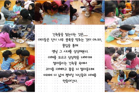 °ÇÃ๰À» ½×´Â´Ù´Â °ÍÀº...... ¾ÆÀ̵éÀº ´ÜÁö ³ª¹« ºí·ÏÀ» ¸ÂÃß´Â °ÍÀÌ ¾Æ´Ï¶ó, ¸ôÀÔÀ» ÅëÇØ ¿¾³¯ ±× ½Ã´ë¸¦ »ó»óÇØº»´Ù. ÀÌÇØ¸¦ ¸ðÀ¸°í »ó»ó·ÂÀ» ´õÇØ°¡¸ç ½×¾Æ¿Ã¸®´Â °ÇÃ๰ ¼Ó¿¡¼ °ú°Å¸¦ ÀÌÇØÇÏ°í ²ÞÀ» ´õ ½×¾Æ¿Ã¸®¸ç ¹Ì·¡¿¡ ´õ ³Ð°Ô ÆîÃÄÁú ÀڽŵéÀÇ ¼¼°è¸¦ ¸¸µé¾î°£´Ù.