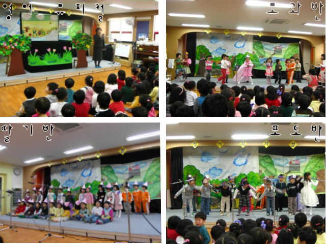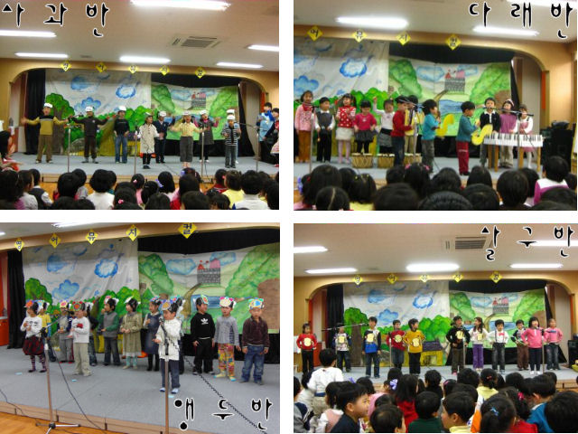 ÀÌ¾î¼ »ç°ú¹Ý¿¡¼´Â "Three Little pigs"(¾Æ±âµÅÁö»ïÇüÁ¦) ¹ÂÁöÄÃÀ» ÇÏ¸ç ¾ÆÁÖ Å« ¸ñ¼Ò¸®·Î ³ë·¡µµ ºÎ¸£¸ç À²µ¿µµ ÇÏ¿´´ä´Ï´Ù. ¾ÞµÎ¹Ý Ä£±¸µéÀº "What`s the Time Mr. Wolf? / My Friends"¸¦ ±×¸®°í ´Ù·¡¹Ý Ä£±¸µéÀº "I am the Music Man / My Crayon`s Talk"¸¦ °¢ ¹Ý Ä£±¸µéÀÌ ³ª´©¾î ±×¸²À¸·Î ¸ÚÁø ¸Ó¸®¶ì¸¦ ¸¸µé¾î À²µ¿À» ¼±º¸¿´½À´Ï´Ù.
